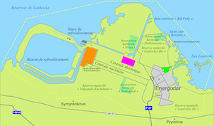 - La zone urbaine d'Energodar avec la centrale nucléaire et la centrale thermique.