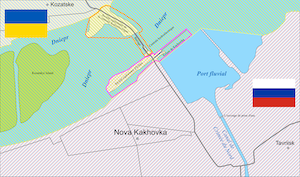 Nova Kakhovka avec son barrage, sa centrale hydroélectrique et son écluse.