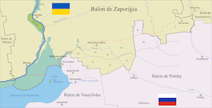 La zone binationale s'étend au nord-est jusqu'à la frontière entre les districts de Zaporijjia[wp] et Vassylivka[wp], qui se trouve approximativement le long de la ligne entre les villages de Bilenke[wp] et Prymorske[wp].